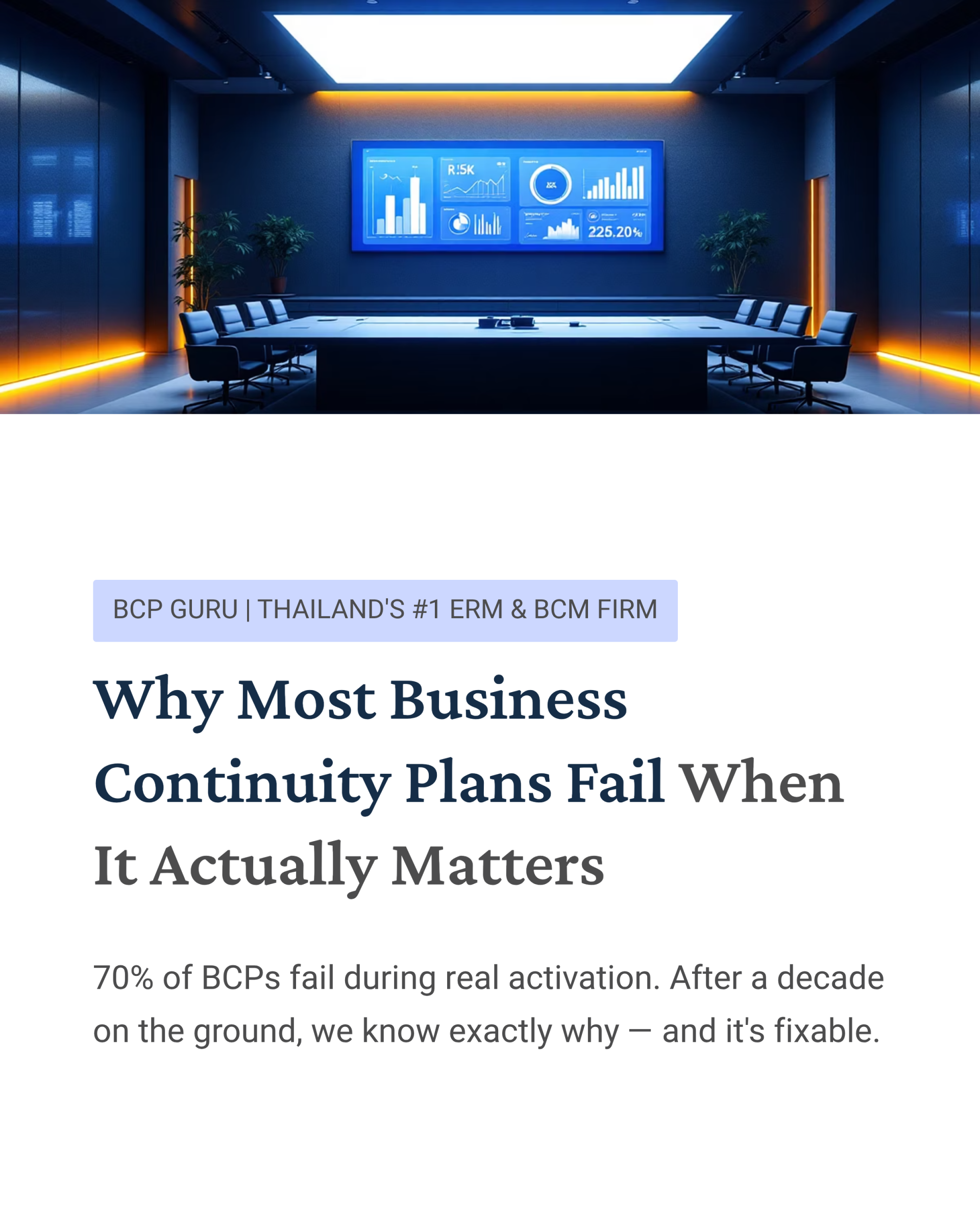 BCP GURU ได้รีวิวแผนความต่อเนื่องทางธุรกิจ (Business Continuity Plan) มากกว่า 200 ฉบับในช่วง 10 ปีที่ผ่านมา และสิ่งที่พบคือ ประมาณ 70% ของแผนเหล่านั้น ไม่สามารถนำไปใช้ได้จริงเมื่อเกิดเหตุฉุกเฉิน