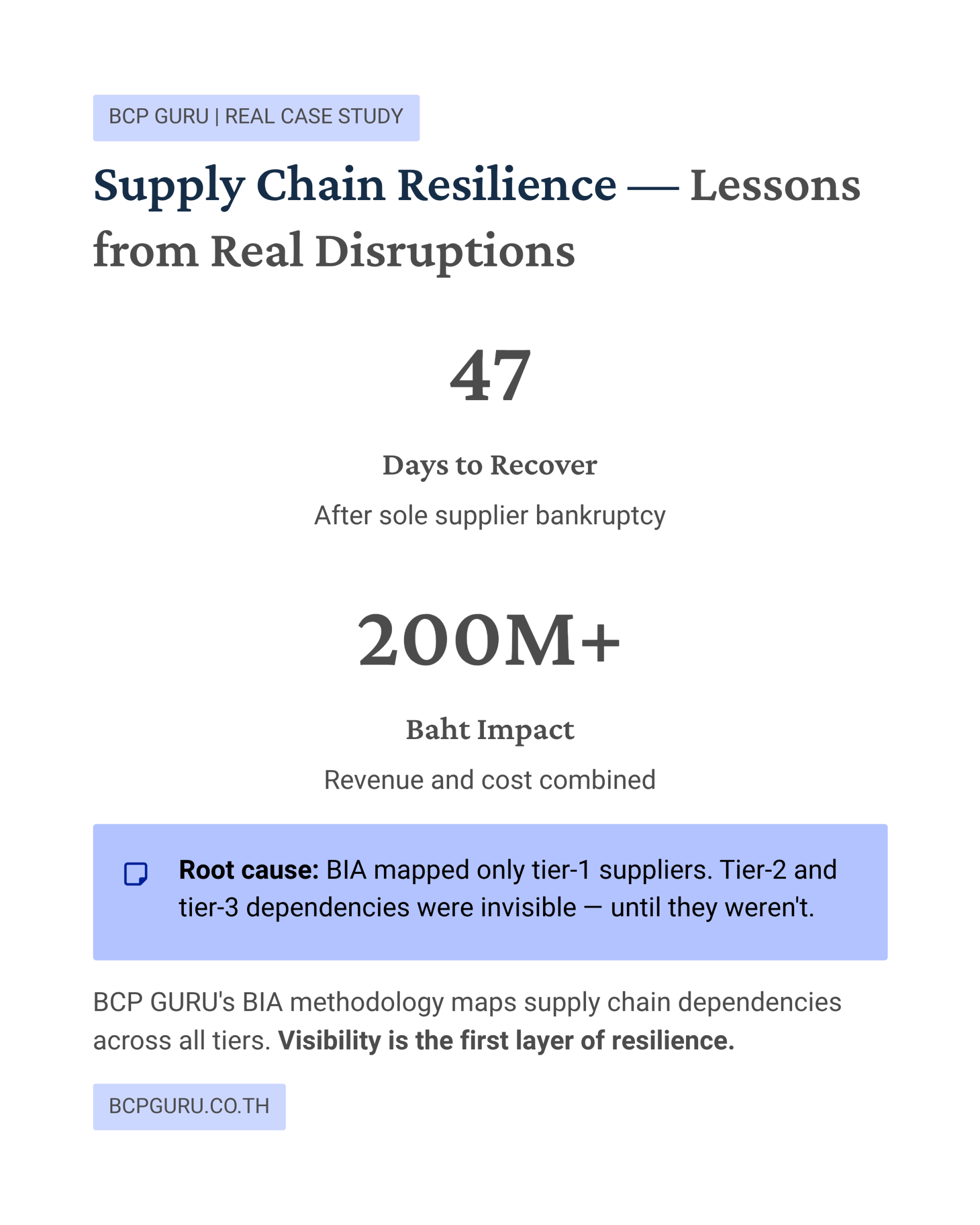 เมื่อ BCP GURU ทำ BIA ตามมาตรฐาน ISO 22301 เราให้ความสนใจเป็นพิเศษกับการพึ่งพาห่วงโซ่อุปทานสำหรับทุกกิจกรรมสำคัญ และสิ่งที่พบมักน่าเป็นห่วง:
