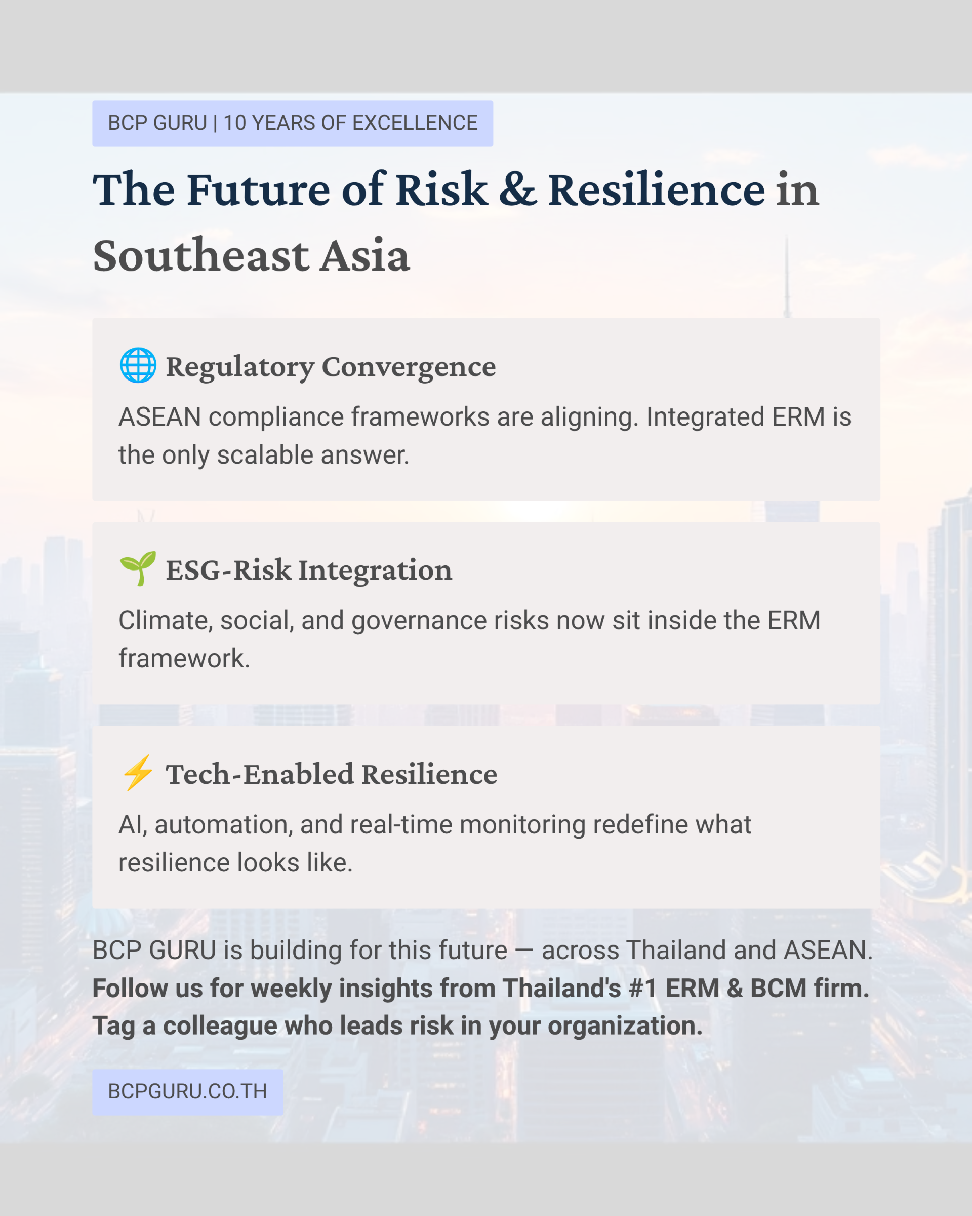 รัฐสมาชิกอาเซียนกำลังปรับความคาดหวังการกำกับดูแลความเสี่ยงให้สอดคล้องกับมาตรฐานสากล องค์กรที่ดำเนินงานข้ามพรมแดนจะต้องการกรอบ ERM และ BCM ที่กลมกลืน ไม่ใช่การดำเนินงานแยกตามประเทศ ISO 31000 และ ISO 22301 ให้ภาษาร่วม แต่การดำเนินงานต้องสะท้อนบริบทท้องถิ่น